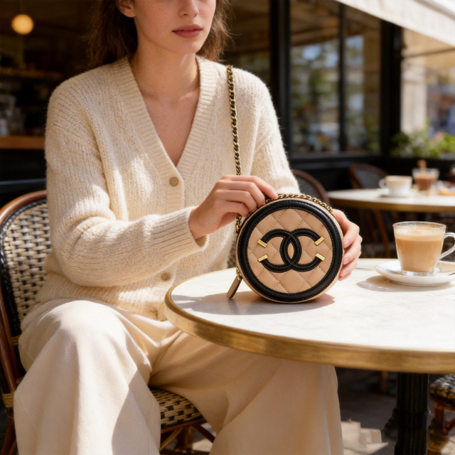 日本女性の日常は、優しくミニマルなスタイルが人気。表参道や代官山でのカフェ巡りやショッピングにぴったりなのが、こちらのベージュのラウンドバッグです。柔らかなベージュのレザーにクラシックなキルティング、丸みを帯びたフォルムが女性的な優しさを引き立て、ブラックの縁取りとゴールド金具の細部にまでこだわりが光ります。